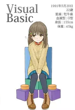 姓氏是Basic,名字是Visual,也有很多人叫她的绰号:VB。小名是Ruby(与那个Ruby没有关系)。从小被某个资产家(不能说他的名字)看上,一家人都寄身于资产家的身边。那时她的名字换了好多次,如今才定下这个名字,有着比较复杂的家庭环境。