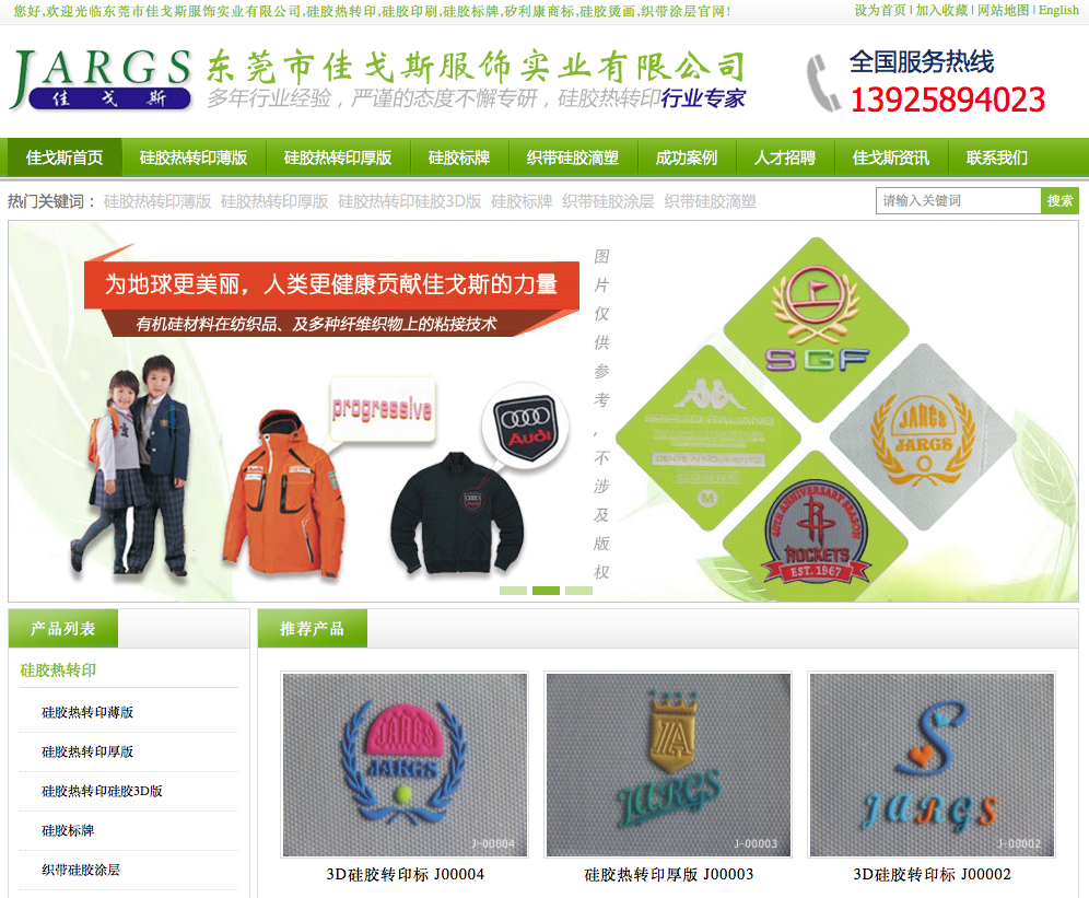 随着时代的进步,行业的发展,传统的热转印商标、烫画的材料已无法满足人类对环保的要求,这将是行业发展的瓶颈。佳戈斯崇尚科学,以多年行业经验,严谨的态度不懈专研,率先在服装辅料行业运用有机硅这一天然的环保材料,并在过去的两年里成功掌握了有机硅材料在纺织品、及多种纤维织物上的粘接技术,从而结束了有机硅商标在服装、箱包、鞋材上无法热转印、烫画的历史,必将为行业增光添彩。同时为地球更美丽,人类更健康供献佳戈斯的力量。